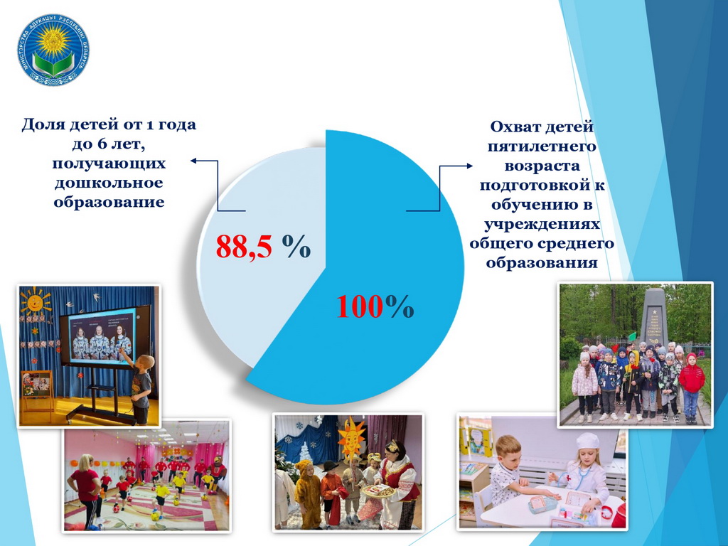 Доля детей от 1 года до 6 лет, получающих дошкольное образование, составляет 88,5 процента. Обеспечен стопроцентный охват детей пятилетнего возраста подготовкой к обучению в учреждениях общего среднего образования.