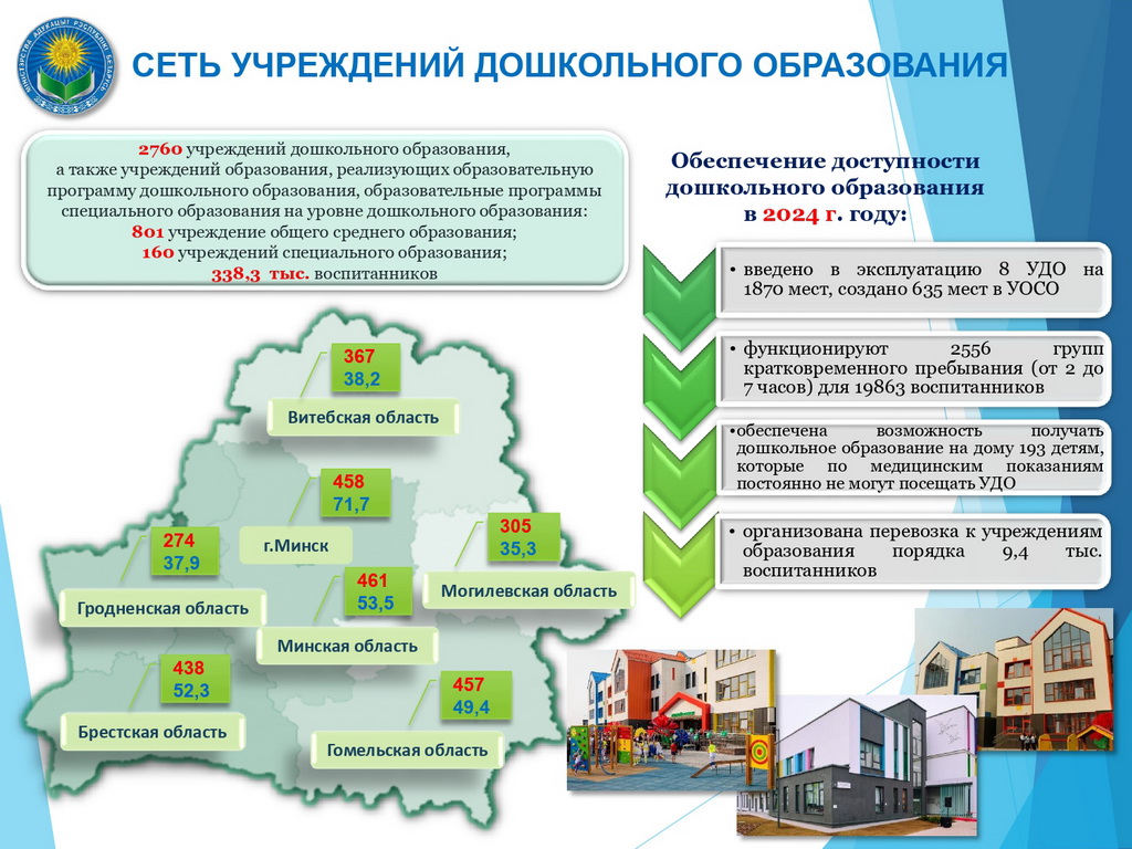 На начало 2024/2025 учебного года функционируют 2760 учреждений дошкольного образования, а также учреждений образования, реализующих образовательную программу дошкольного образования, образовательные программы специального образования на уровне дошкольного образования (далее – УДО): 807 учреждение общего среднего образования, 160 учреждений специального образования для 338,3 тыс. воспитанников.